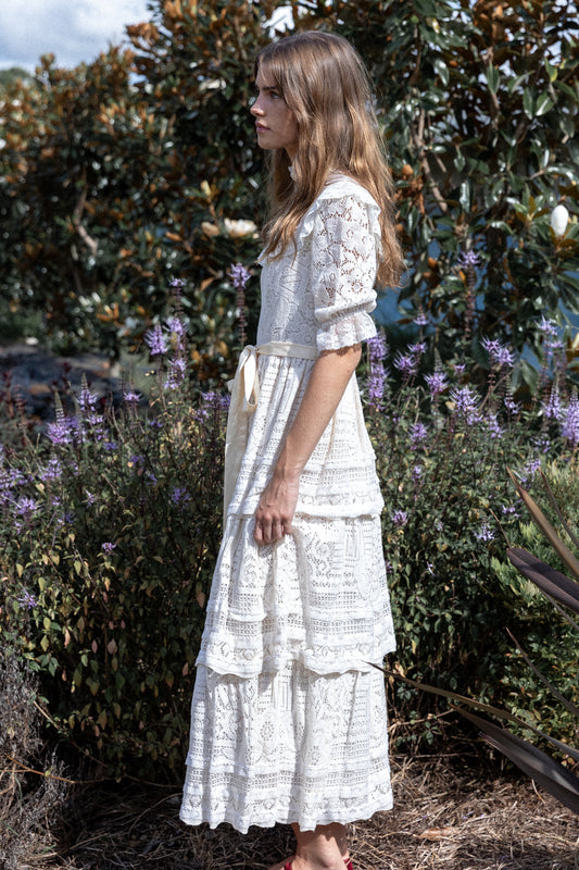 VINTAGE 1970's High Neck Tiered Lace Dress S