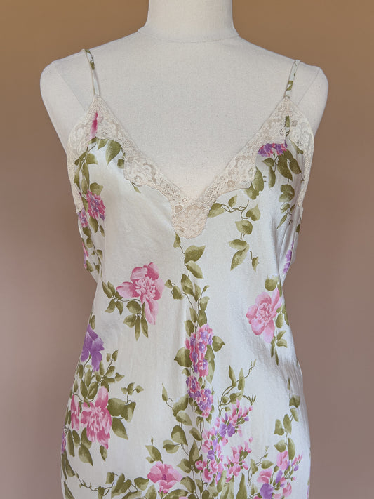 Vintage 100% Silk French Floral Bias Cut Maxi Slip Dress S/M
