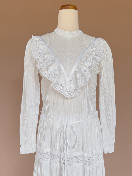 VINTAGE 1960's White Pintuck Cotton High Neck Mexican Wedding Dress S