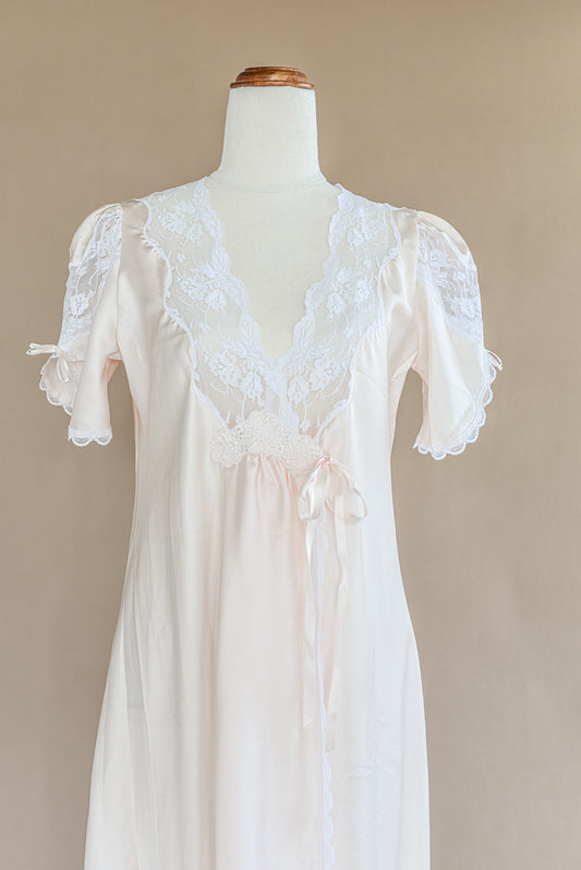 VINTAGE Pink Lace Trimmed Short Sleeve Peignoir Robe S/M