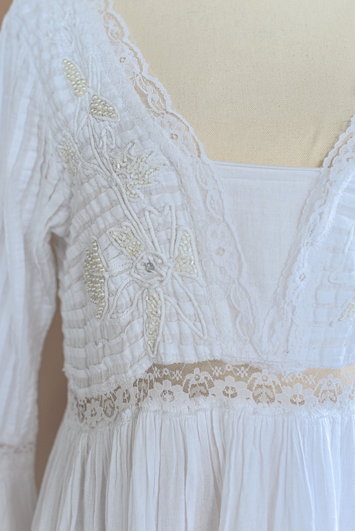 VINTAGE 1960's White Cotton Trumpet Sleeve Tiered Dress S/M