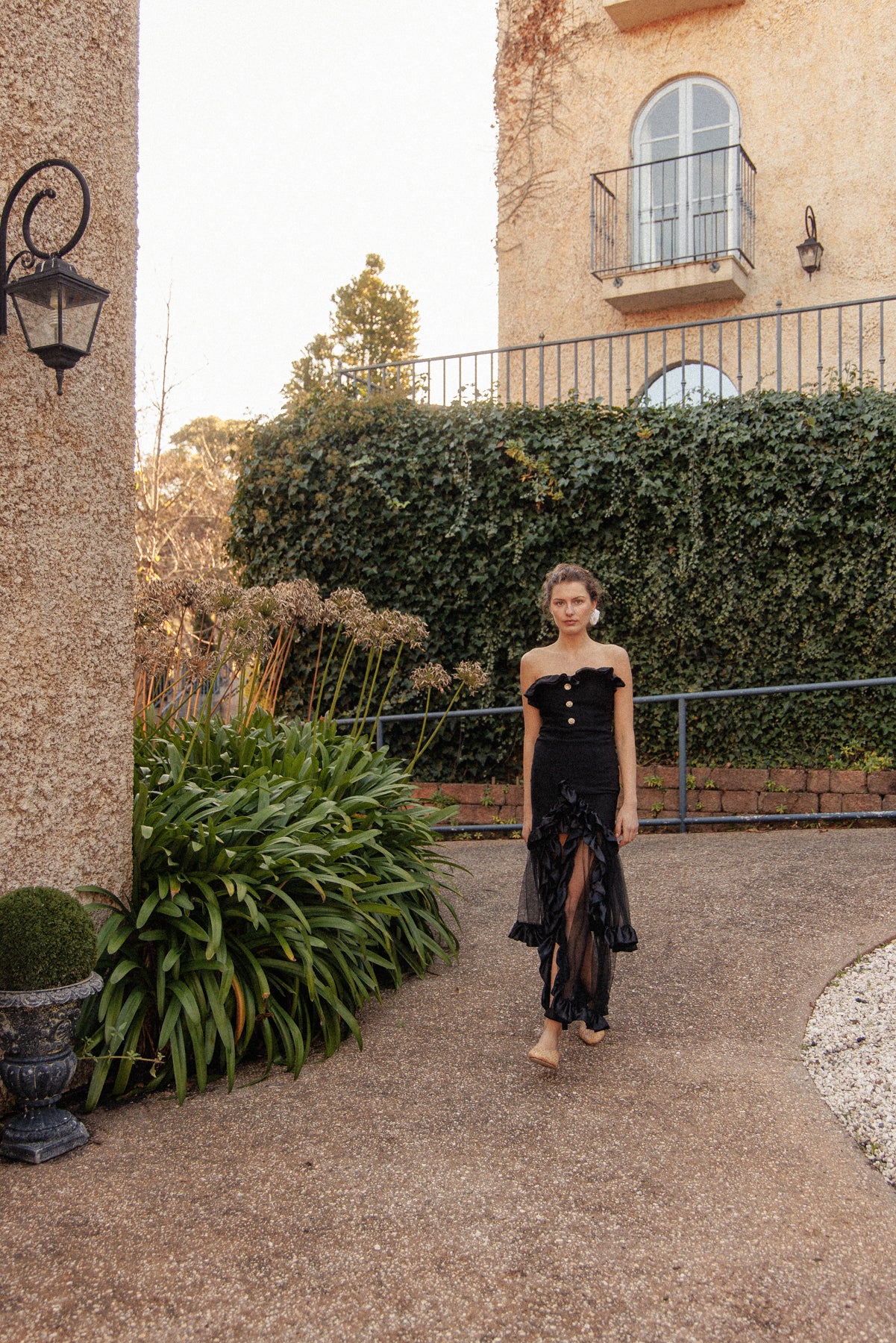 VINTAGE Black Bodycon Dress With Sheer Ruffle Skirt XS/S