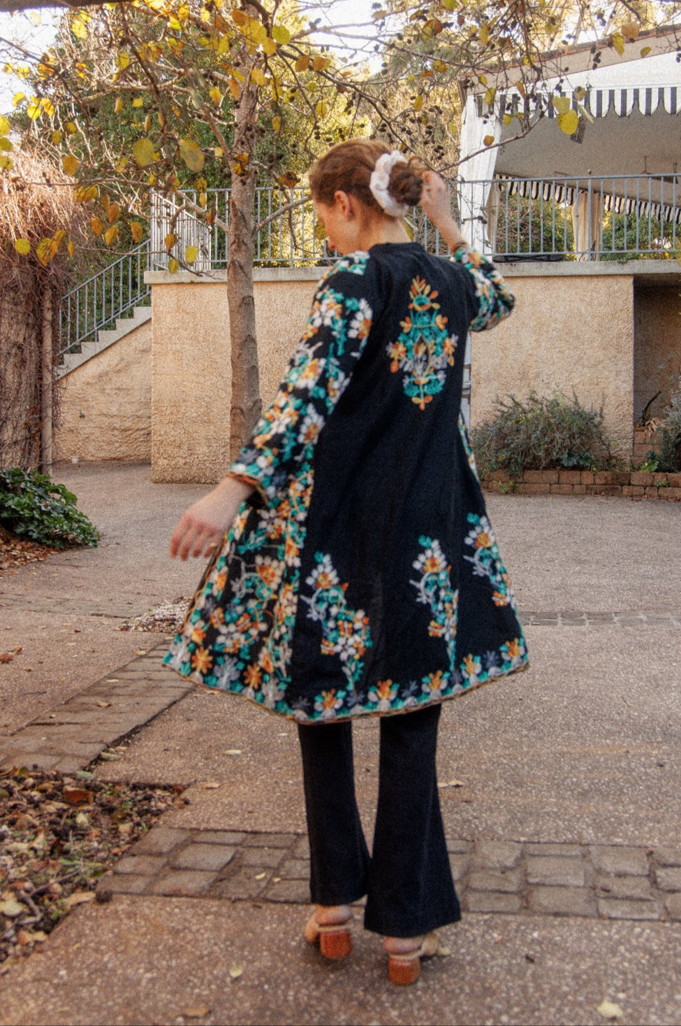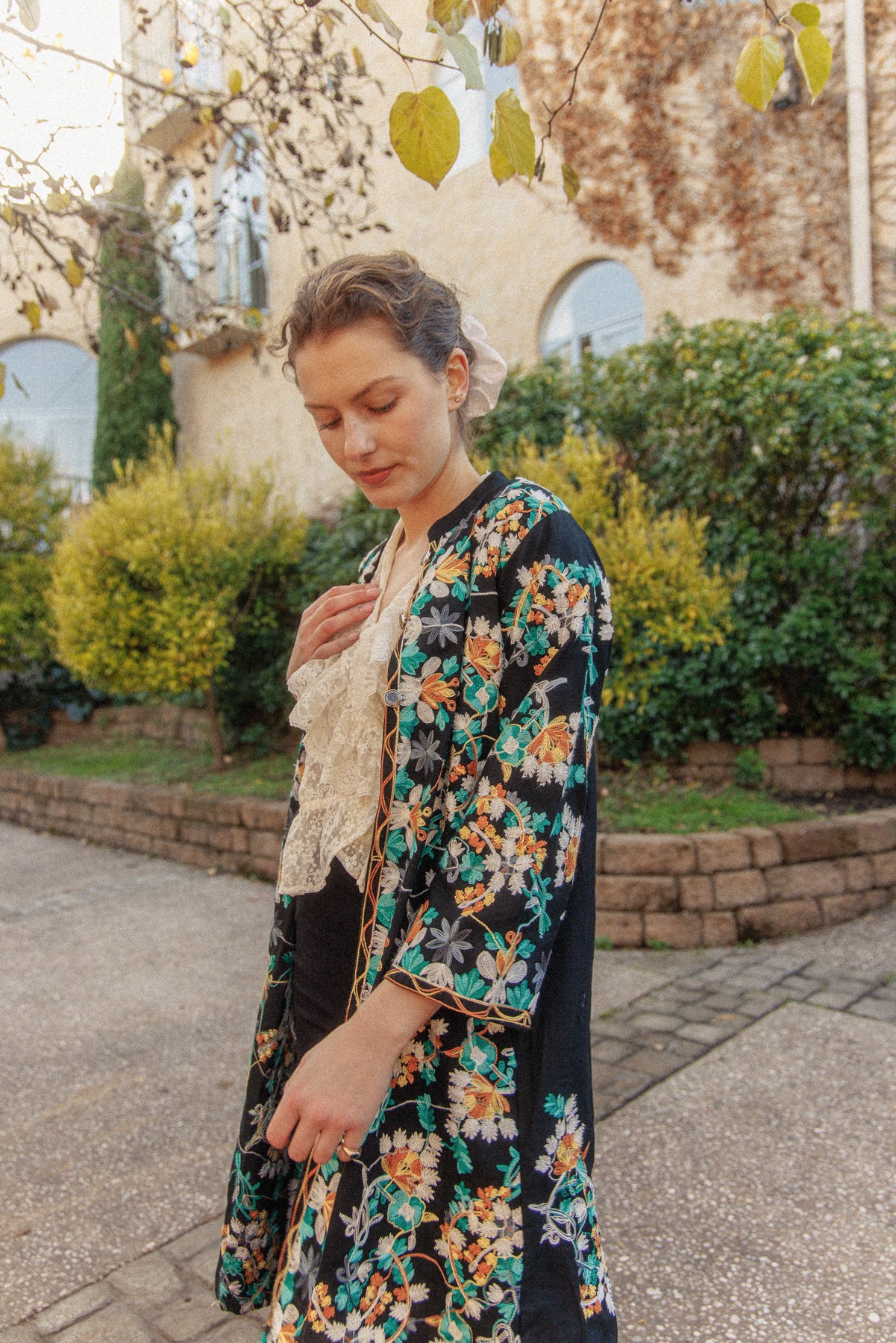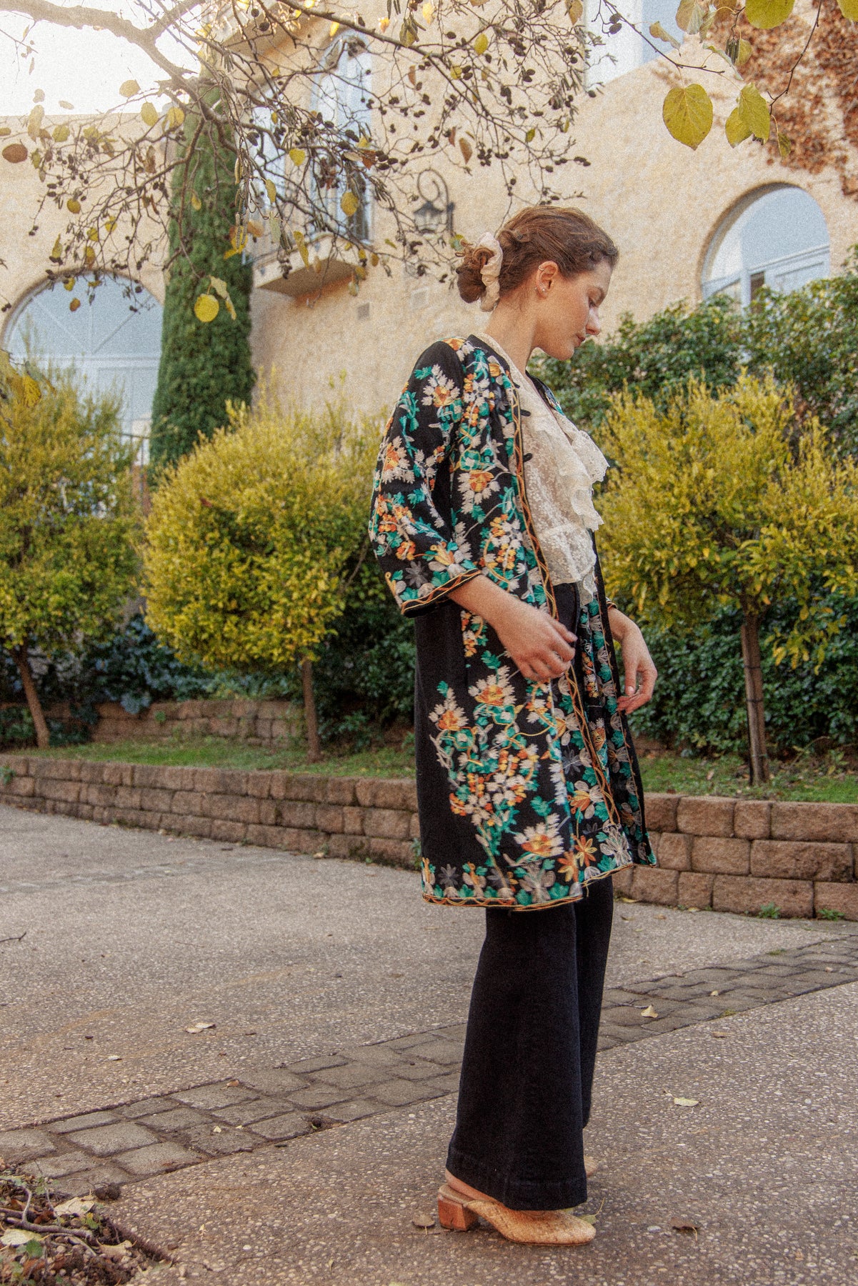 VINTAGE Black Cotton Embroidered Indian Kashmiri Jacket S/M